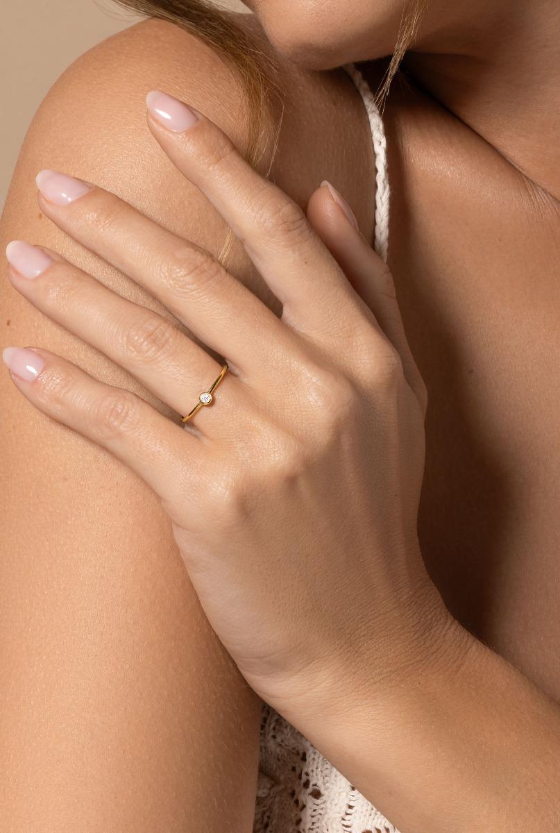她是如此精美...一颗0.05克拉钻石和雅致的18K金指环相互辉映。设计精致。戒指有4种颜色的金材质供选择。