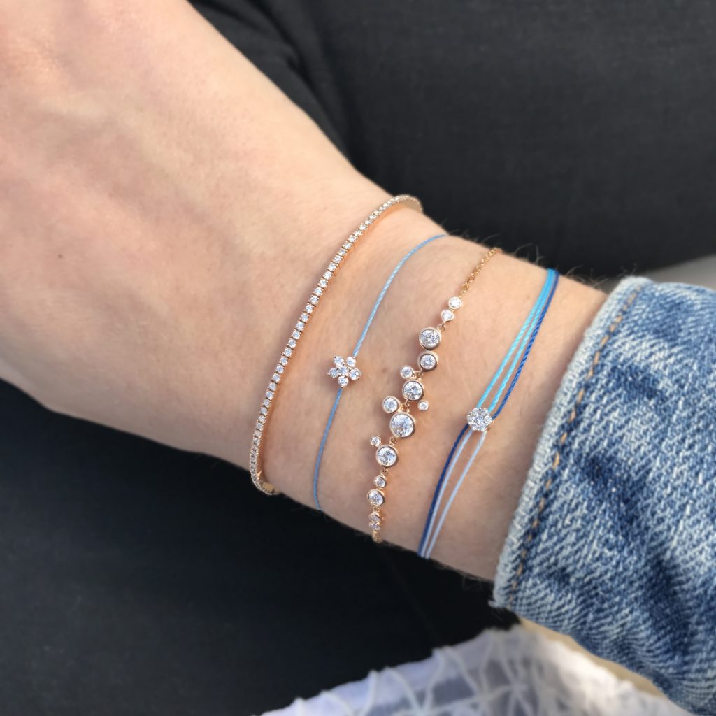 Depuis quelques semaines, le temps est mitigé et capricieux. Chez Redline on mise tout sur nos jolies couleurs pour appeler le ciel bleu et le soleil à nous éclairer. On mixe donc les chaines dorées avec nos multiples fils de couleurs bleus.
