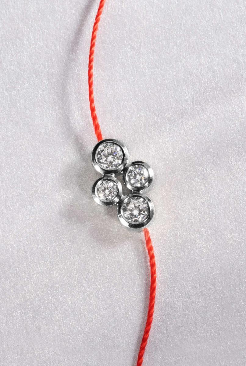 四颗钻石,四倍耀眼光芒。五颗包镶钻石(两颗0.10克拉,两颗0.05克拉)在手链上熠熠生辉,璀璨夺目,和绳线的轻盈相得益彰。18K金的搭扣和三环延长链使首饰可以随意调节长度。首饰有4种颜色的金材质和80种颜色的绳线供选择。