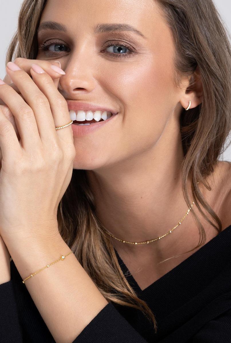 共计0.14克拉的小钻石包围着一颗0.10克拉的钻石点缀在手链上,每一颗钻石都被黄金包镶,黄金链条的衬托给手腕覆盖上温暖的光晕。手链的坚固和舒适使之陪您度过生活中的所有精彩时刻。