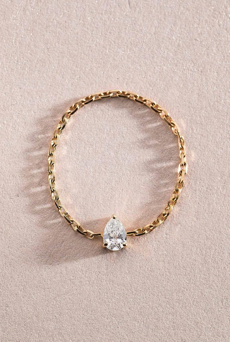 这枚戒指是舒适和坚固的结合,也是优雅和高贵的结合,其上点缀着一颗非常漂亮的0.10克拉的梨形钻石,为您的手指也增添万千光芒。钻石点缀在一条精致的黄金链条上,让戒指更加闪亮。温柔的链制戒指缠绕在您的指间,让您的每日生活都闪耀而精致。