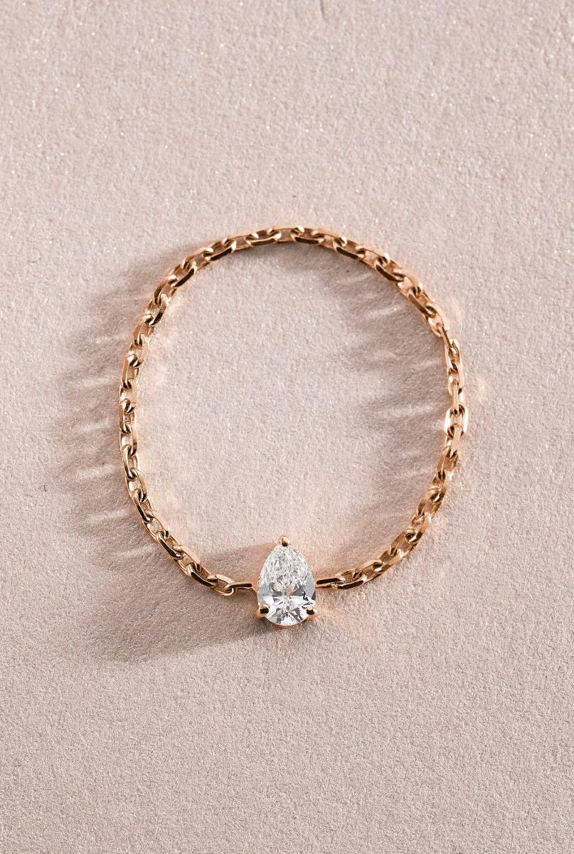 这枚戒指是送与他人的理想礼物,同时也能够用来取悦自己。戒指的中央点缀着一颗玫瑰金爪形钩镶的0.10克拉的梨形钻石。玫瑰金的链条承载着钻石包裹着您的手指,精致细腻使之魅力四射,同时女性化的玫瑰金色也为首饰带来温柔的气质。